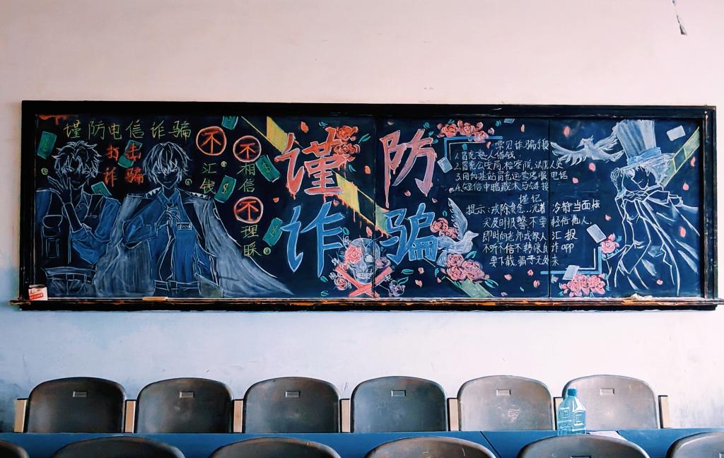 各班级充分利用黑板报这一宣传阵地,围绕“刷单返利”、“游戏账号交易”、“冒充客服”、“AI换脸”等常见诈骗手段,精心设计版面,巧妙构思内容。